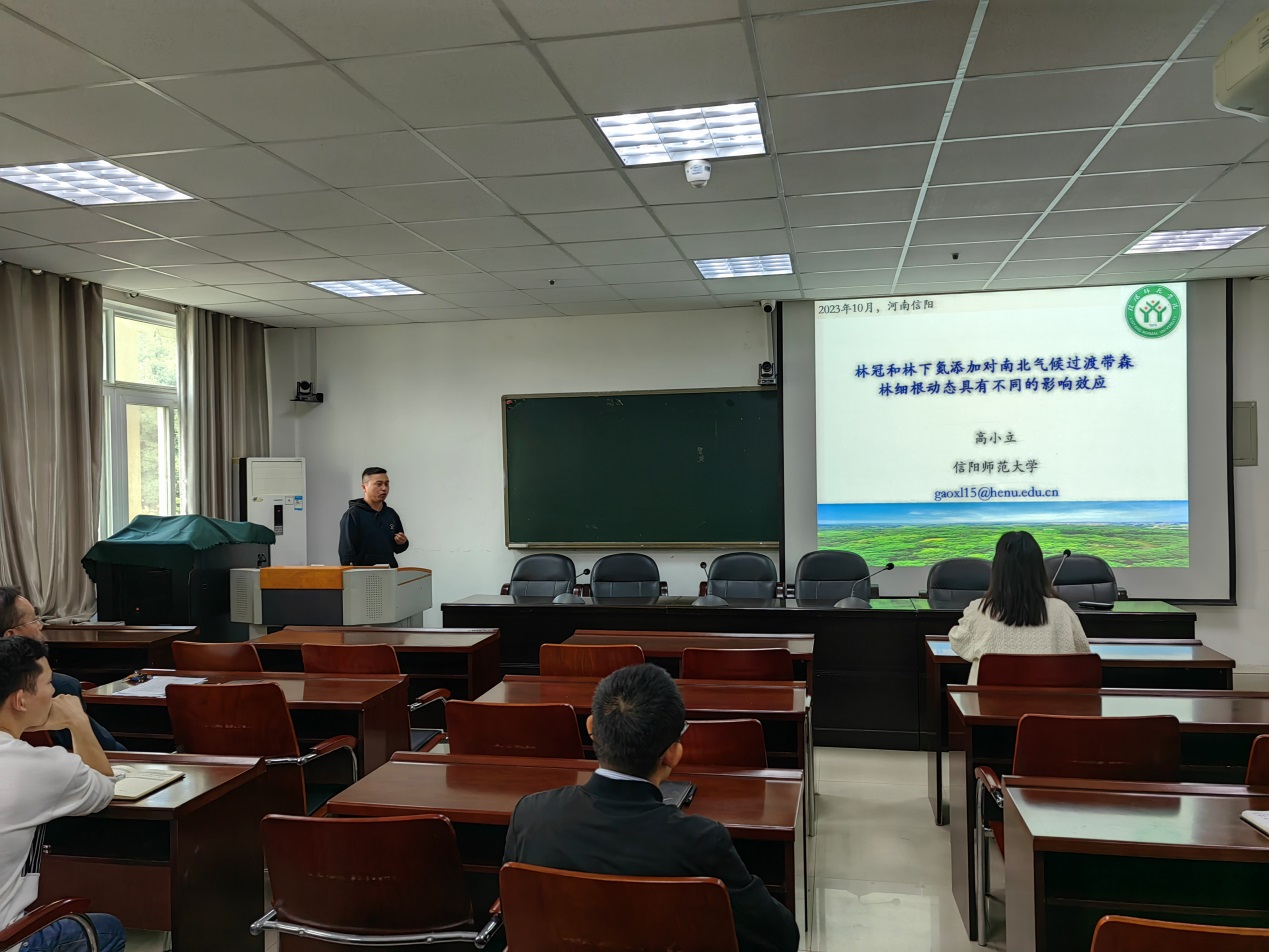 报告中,高博士从“全球变化是全人类共同的挑战”这一国际热点问题为切入点,介绍了全球变化给人类生存环境带来广泛影响,而森林是陆地生态系统的最大碳汇,对减缓气候变化发挥着重要作用;并着重阐述了作为全球变化主要驱动因素之一的氮沉降对森林生态系统C循环和C固存的影响。最后,他详细阐述了课题组近年来在森林细根动态对氮沉降的响应与反馈方面开展的一些实验探索。报告会结束后,高小立就老师们提出的问题进行了一一详细解答。