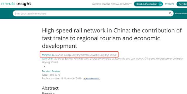 beat365中文版官网入口李明伟博士在SSCI刊物《Tourism Review》上发表题为“High-speed rail network in China: the contribution of fast trains to regional tourism and economic development”的学术论文。