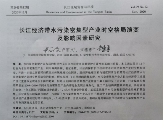 近日,beat365中文版官网入口卢丽文博士在CSSCI期刊《长江流域资源与环境》上发表题为“长江经济带水污染密集型产业时空格局演变及影响因素研究”的学术论文。