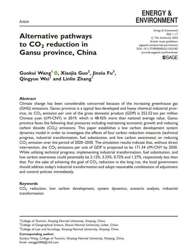 beat365中文版官网入口王国奎博士在SSCI刊物《Energy & Environment》上发表题为“Alternative pathways to CO2 reduction in Gansu province, China”的学术论文。