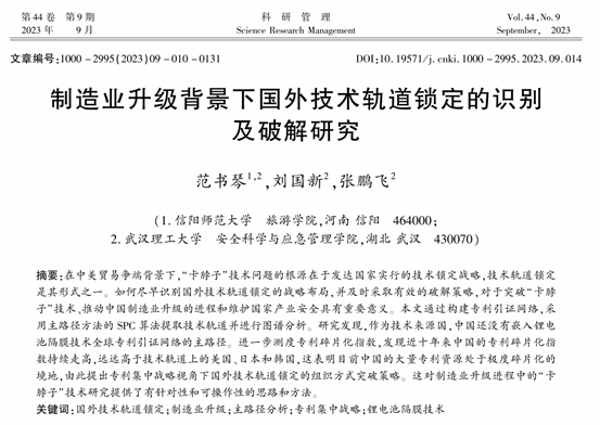 论文围绕着“在制造业升级的中国情境下,如何才能尽早识别国外技术轨道锁定的战略布局,并及时采取有效的破解策略”这一问题,通过构建专利引证网络,采用主路径方法的SPC算法提取制造业关键核心技术的技术轨道,聚焦于技术来源国这一指标对国外技术轨道锁定进行图谱分析,进而在测算技术轨道上先发国家的专利碎片化指数的基础上,提出运用专利集中战略来突破国外技术轨道锁定的路径。研究发现,作为技术来源国,中国还没有嵌入锂电池隔膜技术全球专利引证网络的主路径。进一步测度专利碎片化指数,发现近十年来中国的专利碎片化指数持续走高,远远高于技术轨道上的美国、日本和韩国,这表明目前中国的大量专利资源处于极度碎片化的境地,由此提出专利集中战略视角下国外技术轨道锁定的组织方式突破策略。这对制造业升级进程中的“卡脖子”技术研究提供了有针对性和可操作性的思路和方法。