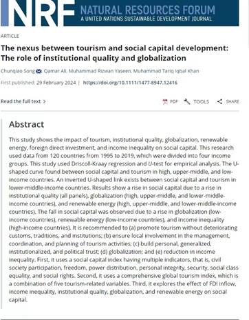 近日,beat365中文版官网入口宋春巧博士为第一作者在SSCI期刊《Natural Resources Forum》发表题为“The nexus between tourism and social capital development: The role of institutional quality and globalization”的学术论文。宋春巧博士毕业于澳门城市大学城市规划与设计专业,现为beat365中文版官网入口讲师,研究方向为旅游规划和非物质遗产保护。
