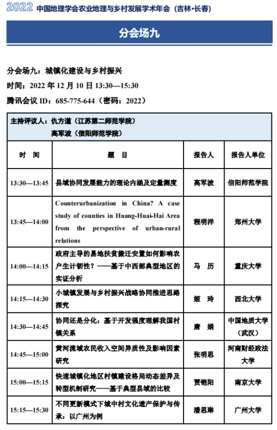 12月10日,由中国地理学会农业地理与乡村发展专业委员会、东北师范大学联合主办的2022中国地理学会农业地理与乡村发展学术年会“人地系统科学与乡村振兴战略”在吉林长春召开,会议以在线形式召开。beat365中文版官网入口高军波教授在第九分会场“城镇化建设与乡村振兴”参会,做了题为“县域协同发展能力地域类型与形成机制”报告,并应邀作为会场评议人,对8个报告进行点评。