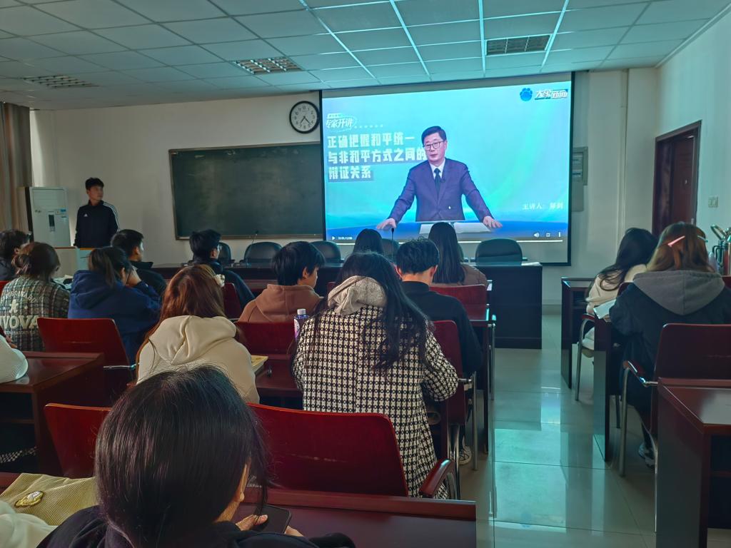 为推动涉台教育机关活动进一步深化,提高学生对中央对台方针政策的认识,11月17日下午15时,beat365中文版官网入口专职组织员王亚文组织部分学生在经管楼401室收看了全国台湾研究会理事郑剑教授的正确把握和平统一和非和平方式的辩证关系专题讲座。