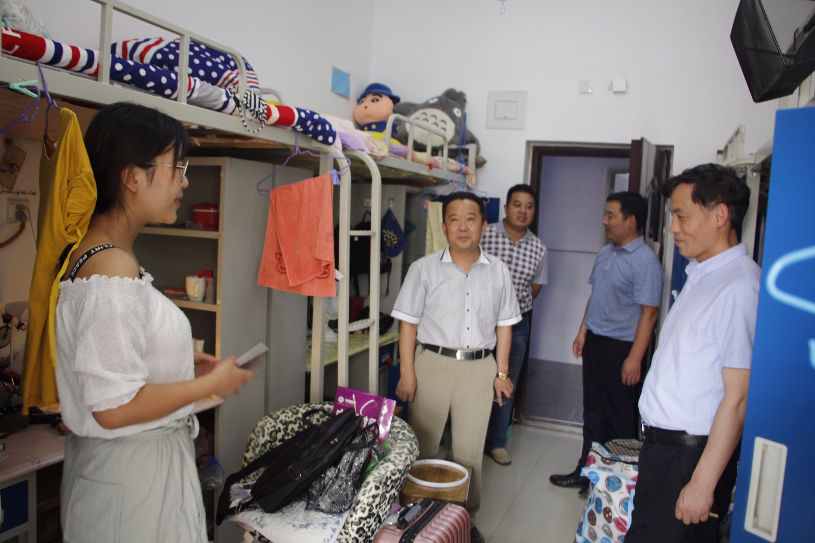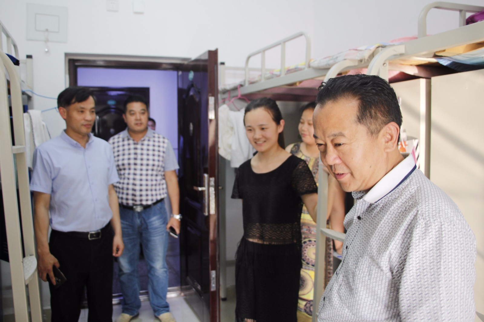 6月14日下午,在2018届毕业生离校之际,beat365中文版官网入口党委书记曹明贵、院长彭荣胜、副院长潘国兵、郭军升、党委副书记张晓峰等领导携学院所有辅导员老师走访了2018届学生宿舍,对即将离校的毕业生表示关心和关爱。