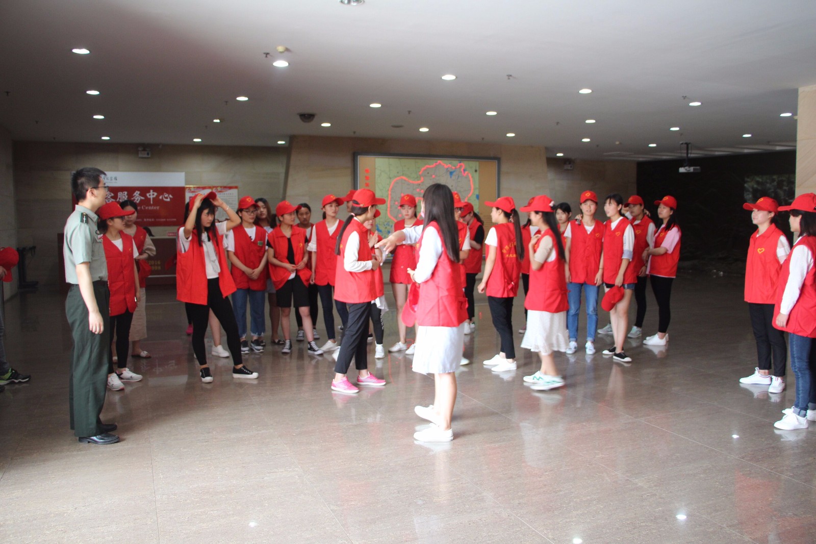 活动共分为鄂豫皖革命纪念馆志愿服务、旅游知识讲解及微博三个主题。5月19日,我院积极组织学生代表赴鄂豫皖革命纪念馆参与馆内的志愿服务活动。36名学子参加此次志愿服务队。志愿者步行至鄂豫皖革命纪念馆前进行集合,每人穿戴了红色志愿服及志愿帽并组织有序的进入馆内。随后在馆内工作人员的指导和协调下,志愿者根据志愿活动内容每人坚守七个展厅的各个陈列台前、门口或危险地方,负责馆内不文明行为的制止和范围内对游客行为的帮助提醒。天气炎热,参观人员的增加并没有使志愿者放弃,她们依旧认真坚守自己的职责,为参观群众开门问候,微笑回答提醒游客的各种疑问行为。最终同学们的志愿服务活动得到了馆内工作人员和众多游客的一致好评,对信阳红色文化的传播起到了很好的效果。
