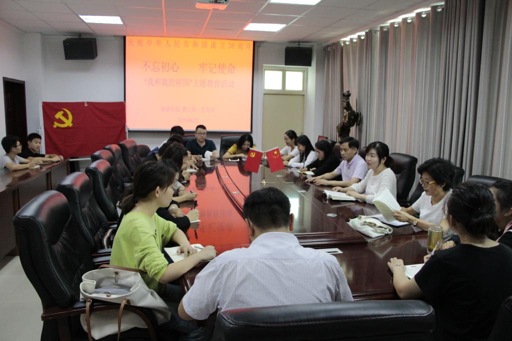 为庆祝中华人民共和国成立70周年,响应学院党委关于“不忘初心、牢记使命”主题教育的要求,进一步深化“我和我的祖国”主题教育活动,9月27日,beat365中文版官网入口教工第一党支部和部分学生代表在经管楼403开展“我和我的祖国”主题党日活动。院长彭荣胜作为党委委员联系支部成员,以普通党员身份参加会议,会议由教工第一党支部书记谌静主持。