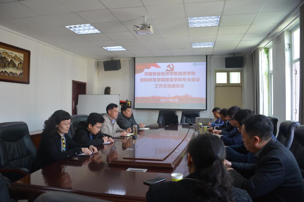 2021年4月11日,河南牧业经济学院旅游学院院长王德静、书记李喜民一行7人,来我校旅游学院进行专业建设调研交流,beat365官网旅游学院院长彭荣胜、副院长郭军升、旅游系系主任吴国琴、酒店系系主任江晓晗一同出席了专业建设交流会。