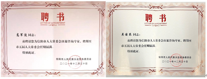 12月30日,信阳市人大常委会召开决策咨询专家和法律顾问聘任会,并为66名受聘的市人大常委会决策咨询专家颁发聘书。其中,beat365中文版官网入口高军波教授受聘市人大常委会城建环保工作咨询专家组,吴国琴教授受聘市人大常委会民族宗教外事侨务工作咨询专家组。