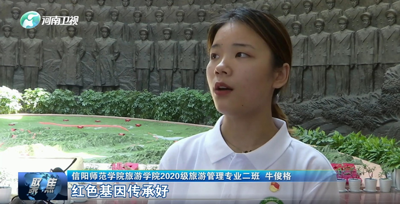 在鄂豫皖苏区首府烈士陵园、鄂豫皖苏区首府革命博物馆,牛俊格同学为实践团队师生讲解了优秀红色故事作品《大别山下杜鹃红》,并接受了河南卫视的采访,牛俊格同学说道: “参加这次暑期行走大思政活动,让我感触颇深,每次来到这片红色沃土,我都有新的感受。一幅幅照片,一桩桩英雄事迹,一份份历史材料,一串串数字时刻提醒着我们今天的幸福生活来自不易。一代人有一代人的使命,一代人有一代人的长征,新时代长征路上,我们青年要牢记习近平总书记嘱托,讲好中国故事,把红色资源利用好,红色传统发扬好,红色基因传承好,在新时代赶考路上,用青春奋力奔跑出好成绩!”
