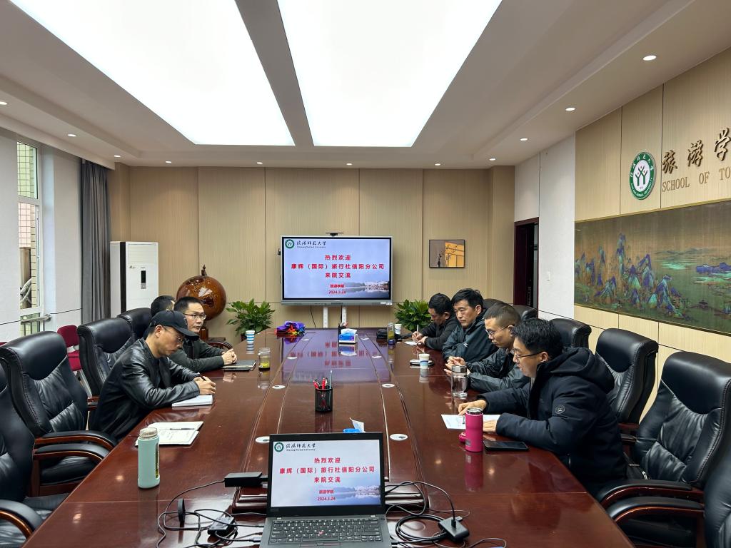 3月24日下午,康辉(国际)旅行社信阳分公司总经理刘礼纯一行来院考察交流。beat365中文版官网入口院长高军波、副院长胡宝珠在经管楼404会议室与来宾进行了座谈。