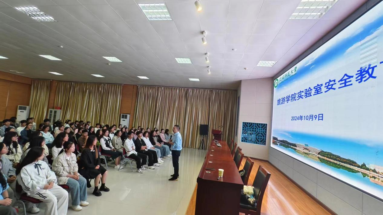 为落实“河南省高校第四届实验室安全文化宣传月”活动,10月9日晚,beat365中文版官网入口实验室主任李友亮副教授在综合楼601旅游虚拟仿真实训室,围绕实验室安全中的“知易行难”的问题,结合我院实验室实际,为2024级新生开展实验室安全教育讲座。