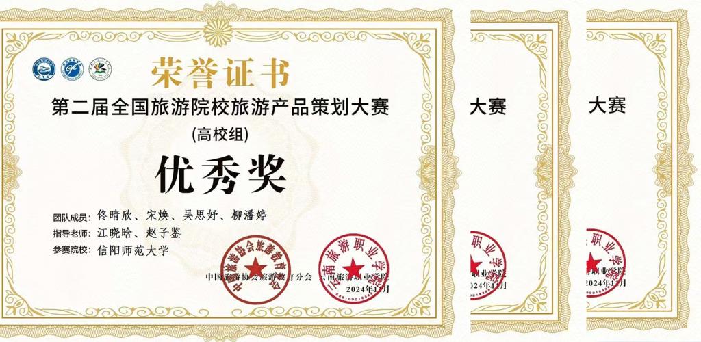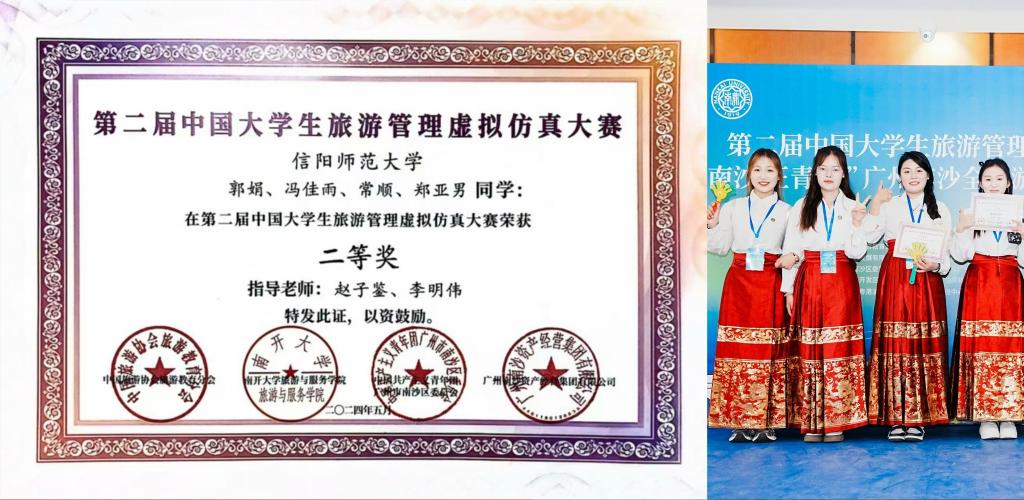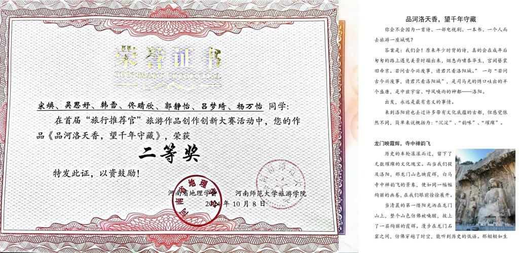 2024年9月,在河南省地理学会、河南师范大学联合举办的首届全国大学生“旅行推荐官”旅游作品创新大赛中,由beat365中文版官网入口教师赵子鉴指导的宋焕团队(吴思妤、韩雪、佟晴欣、郭静怡、吕梦琦、杨万怡)作品《品河洛天香,望千年守藏》荣获二等奖。